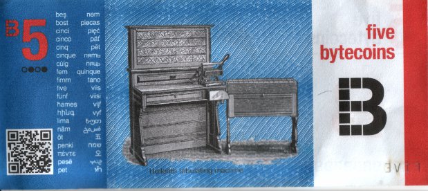 While bitcoins are getting a lot of press, I thought I would pimp an even newer currency that has been circulating through the Seattle Hacker scene. Bytecoin [1], not to be confused with Bitbills [2] or Bitcoins [3] are a paper currency with no crypto security features. That means that in order to counterfeit a bytecoin, you simply need to copy it perfectly. On the other hand, bytecoins are cool, pretty, and worth the paper and ink they are printed on. Being real-world counts for something. I procured a sample and scanned it with my old scanner and made a 1450 dpi copy of the front and back of the 5 bytecoin to show the craftmanship of the bill. Of course, with a decent printer, you could use this image to counterfeit the currency as well. Time will tell whether bytecoins become worthy of counterfeiting, but I feel that the currency is worth something. The fact that I am posting hi-res scans means that the bytecoin is worth something to me. I am grateful to the author who was willing to let me post these scans.